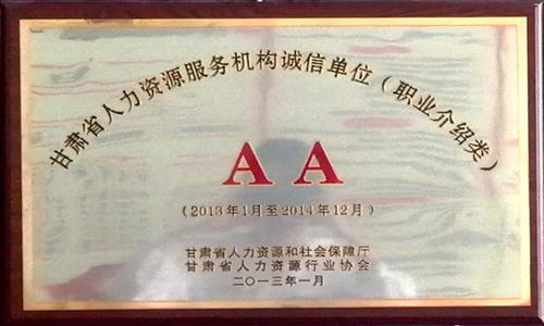 2013年2月公司職介所被甘肅省人力資源和社會(huì)保障局、甘肅省人力資源行業(yè)協(xié)會(huì)授予“AA級誠信單位”;